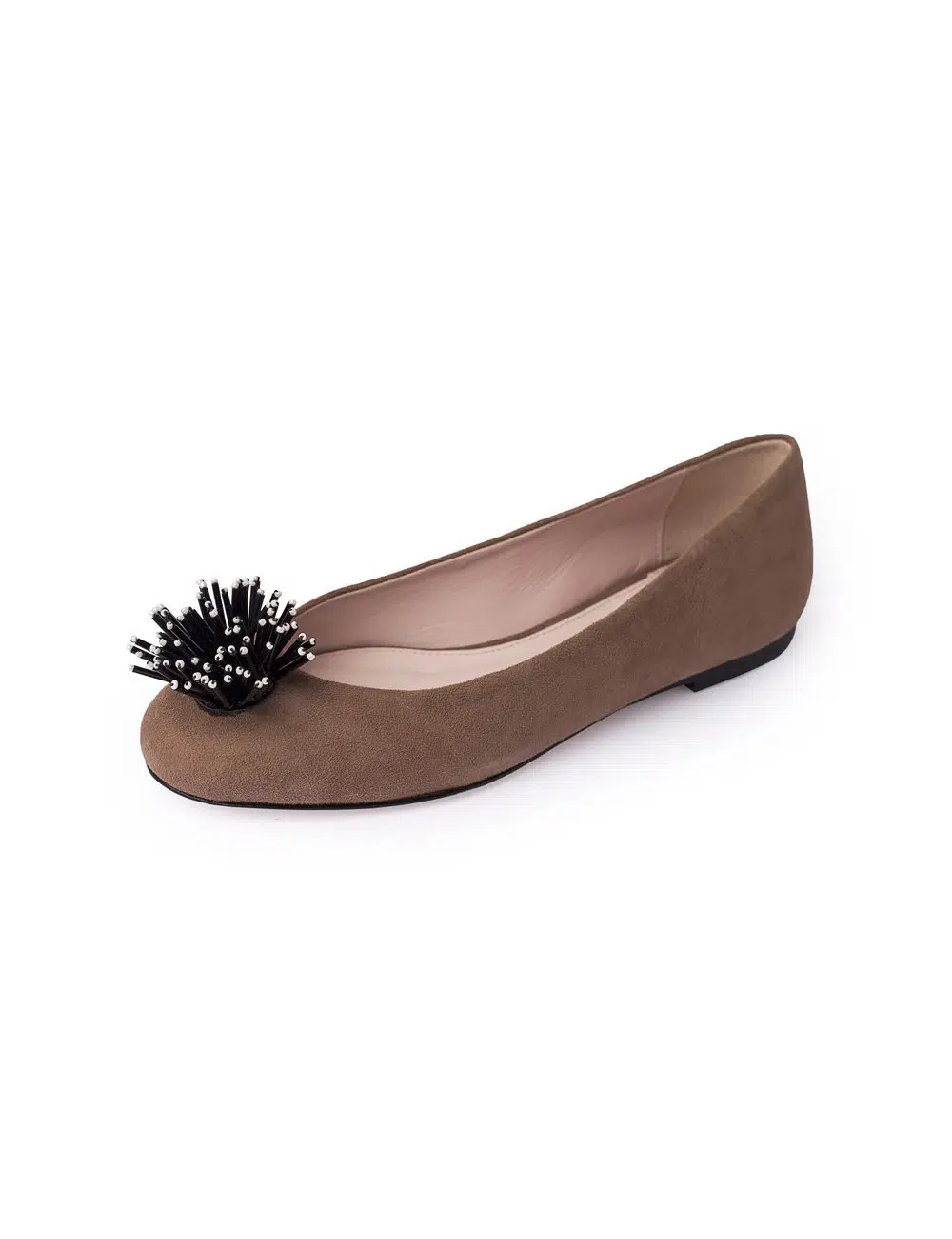 CORRE, ÚLTIMO PAR! Versão ballerina da nossa flat inspirada nos imponentes ouriços-do-mar. Nossa ballerina ouriço tem a fôrma alongada, super elegante e clássica. Modelo feito em camurça nude e pompom de maxi canutilhos e miçangas bordados à mão. Básica, mas totalmente fora do comum! Fica perfeita com comprimentos midis e também com jeans de boca estreita!