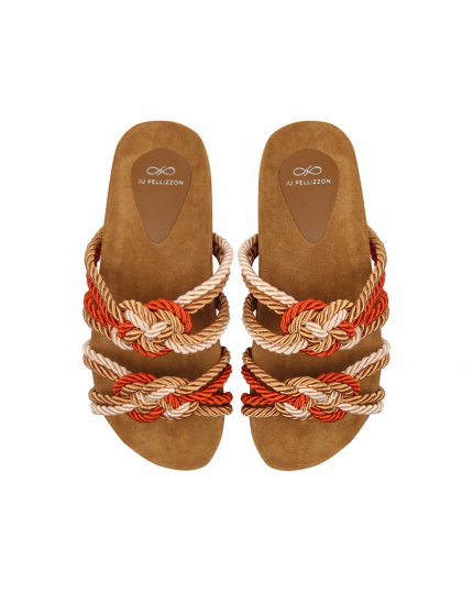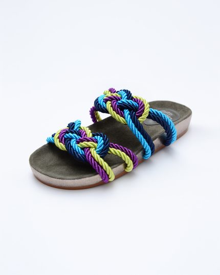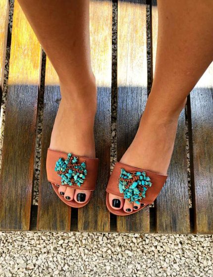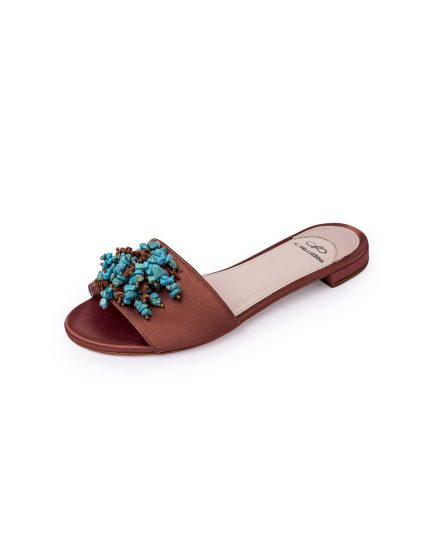 Sandália flat em cetim verde musgo com bordados em corais vermelhos e conchas naturais, inspirada no fundo do mar de Cinque Terre, um pé completa o desenho do outro! Solado em couro e salto rasteiro forrado com cetim verde musgo.
