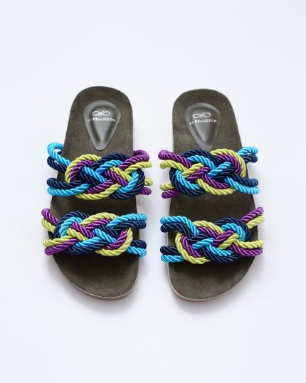Inspirada no fundo do mar de Cinque Terre, um pé completa o desenho do outro, super divertida e fora do comum! Modelo feito em cetim verde musgo com corais vermelhos e conchas naturais bordadas à mão um a um.