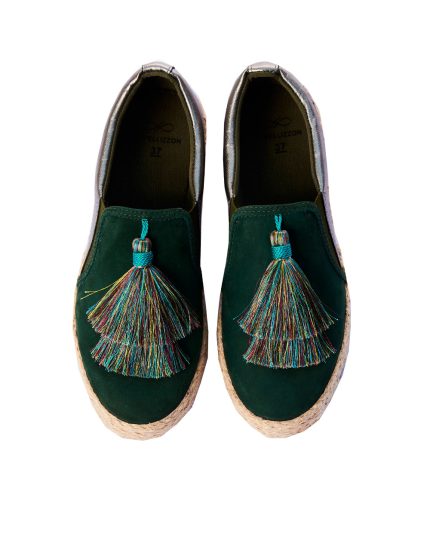 Loafer em camurça petróleo com bordados em linha inspirado nos campos de girassóis da Toscana, que deram origem a este bordado cool e exclusivo, um pé completa o desenho do outro. Solado em couro e salto rasteiro em fachetes de couro.