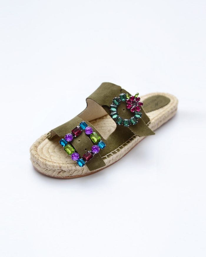 CORRE, ÚLTIMOS PARES! As espadrilles são a cara do verão, nesta coleção criamos fivelas exclusivas, uma quadrada e a outra redonda com flor, feitas com cristais coloridos nos tons de verdes, azuis e roxos, que deixam o modelo mais sofisticado, pois contrastam com o rústico das cordas, uma joia nos pés! Toda feita em camurça fendi um tom de oliva, fivelas exclusivas de cristais e solado importado espanhol feito com fios de juta trançados à mão. As tranças de juta, por ser um material natural, é absorvente, maleável e muito confortável! Nossas espadrilles ficam perfeitas com roupas leves de verão, até um short jeans com camisa, abuse para um look super estiloso, confortável e cool!