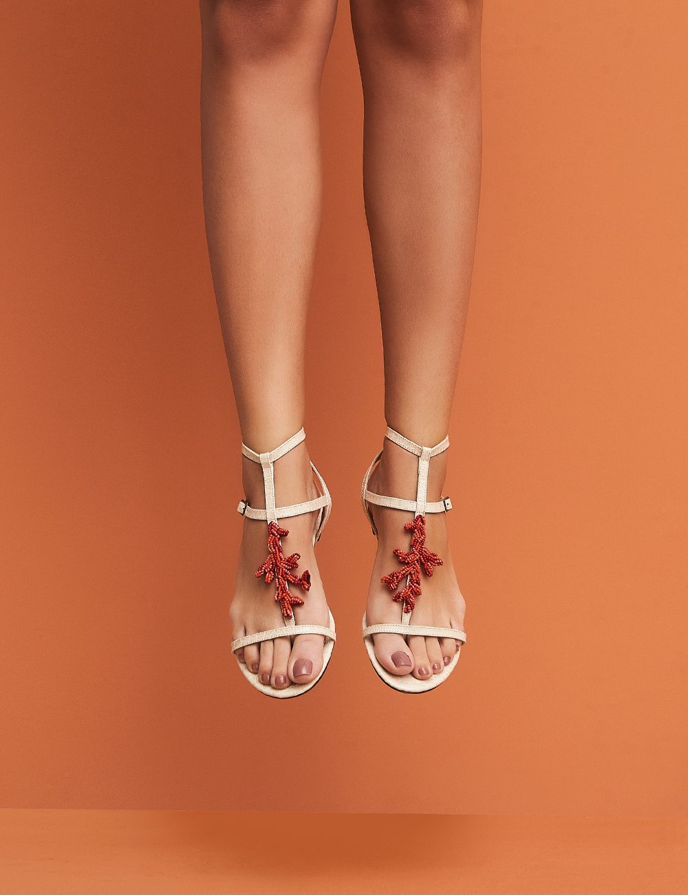 CORRE, ÚLTIMO PAR! Sandália rasteira gladiadora modelo t-bar inspirada nos corais da costa do mediterrâneo de Cinque Terre! Feita em couro com textura croco metalizado off white e corais bordados com miçangas e vidrilhos, super fun! Trabalho primoroso todo feito à mão, elegante e atemporal, esta rasteira é a peça-chave de qualquer produção.