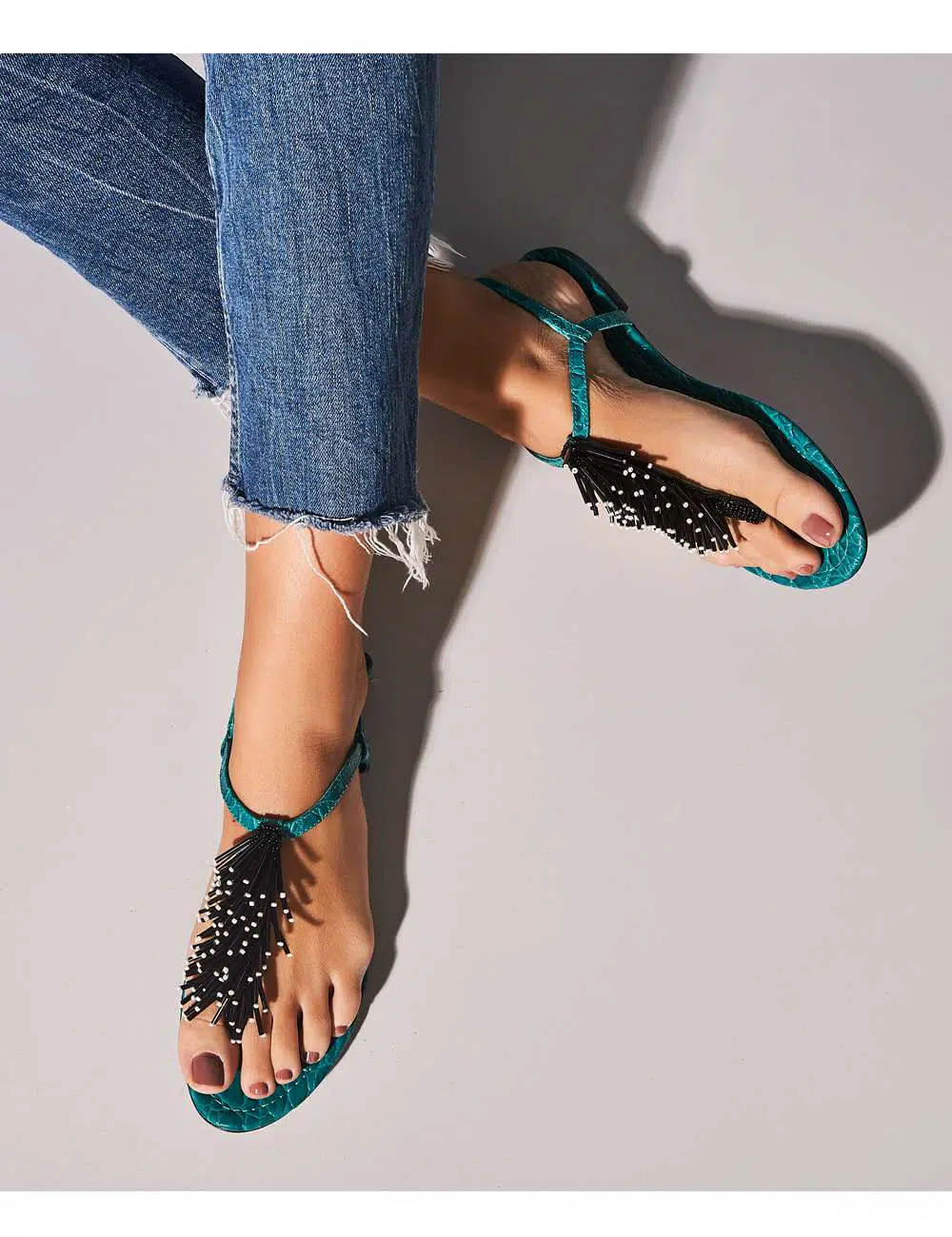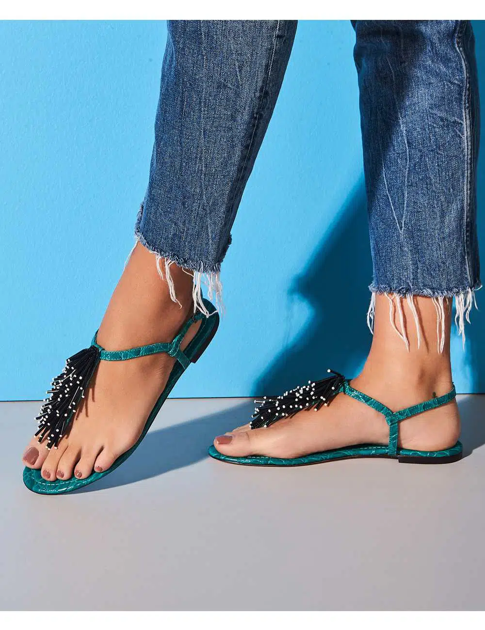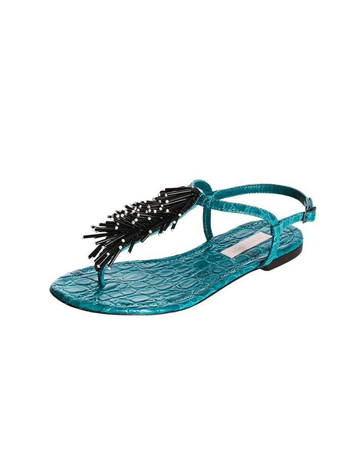 CORRE, ÚLTIMO PAR! Sandália rasteira modelo t-bar inspirada nos imponentes ouriços-do-mar! Feita em couro com textura croco turquesa, maxi canutilhos e miçangas bordadas à mão um a um num trabalho super primoroso. Esta flat é super divertida e ousada, deixará seus looks de verão mais interessantes! Fica perfeita tanto em produções mais casuais, como também looks mais sofisticados para a noite.